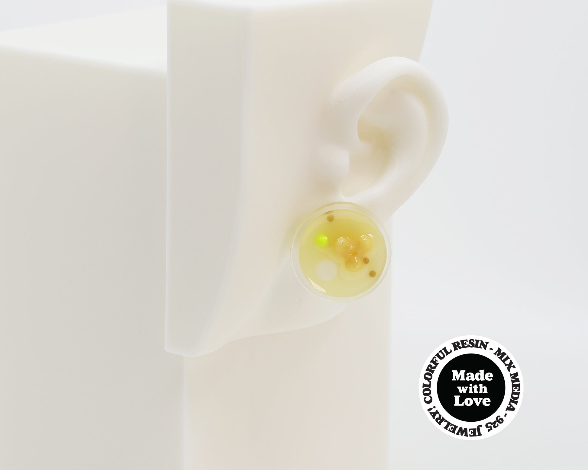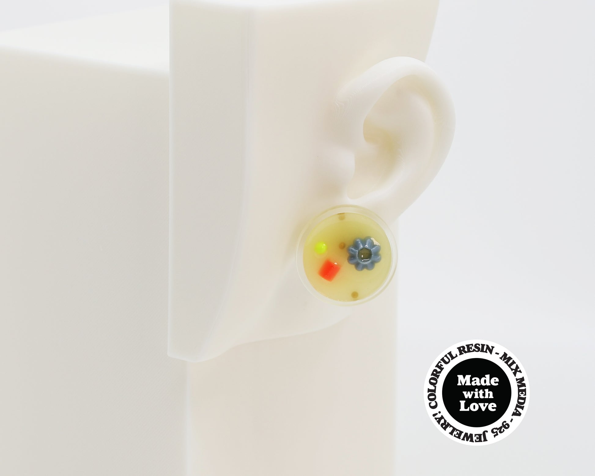 These earrings showcase a distinctive asymmetrical design. They feature vibrant, colorful resin designs mounted on a clear 3D resin-printed base. This modern one-of-a-kind design will add an artistic touch to any outfit!