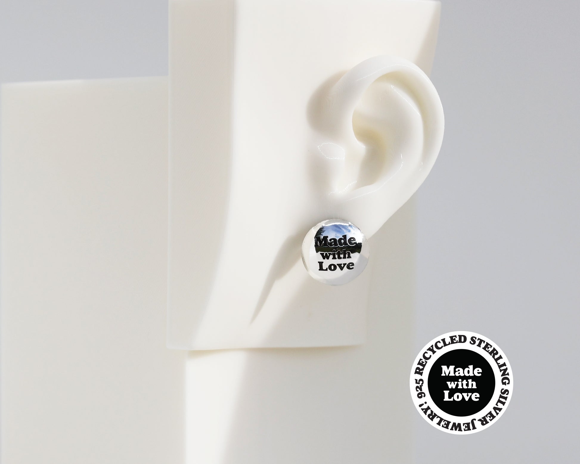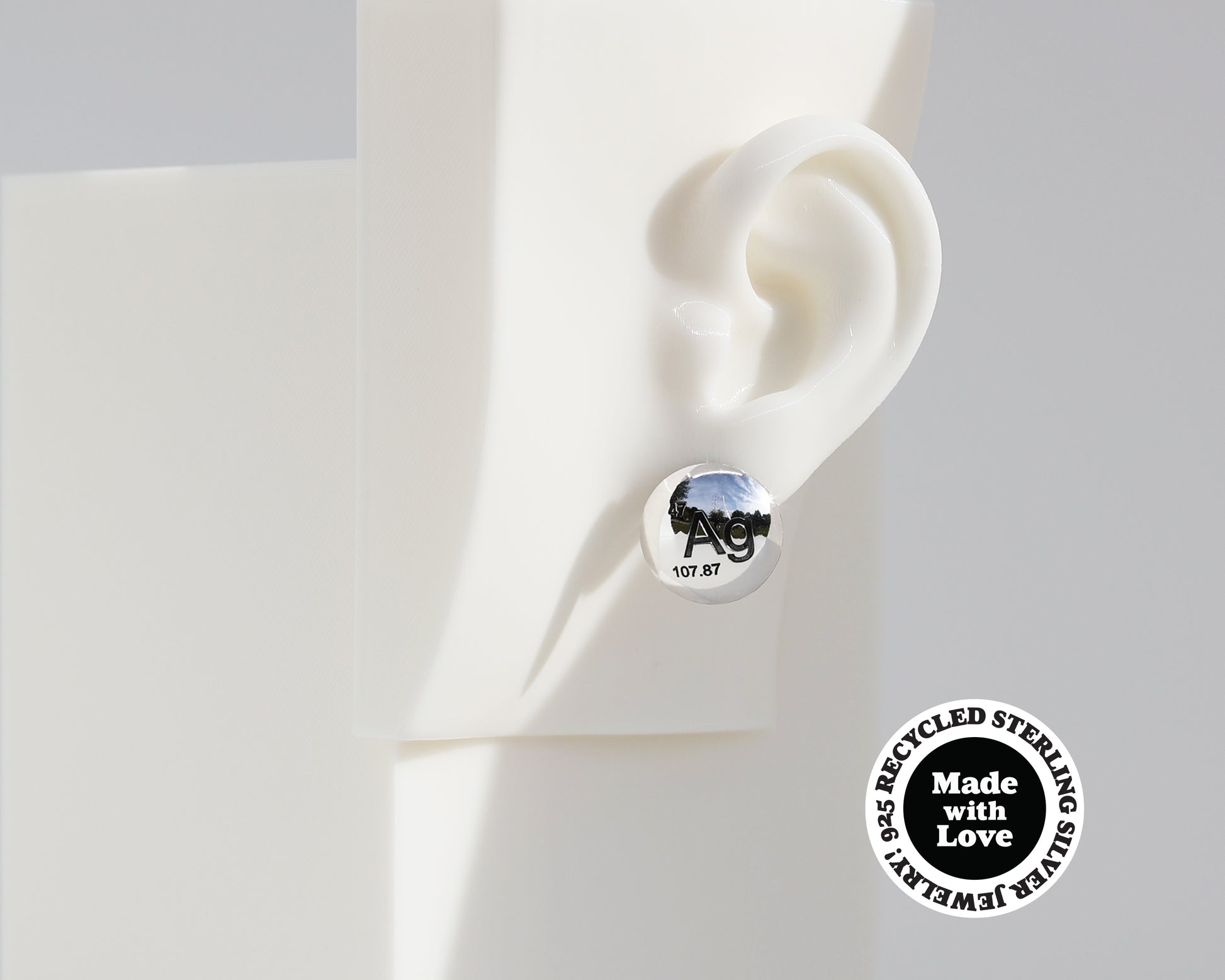 Enhance your ensemble with these captivating sterling silver asymmetrical dome earrings. The unique asymmetry of the engraved "Ag" as the symbol of silver in the periodic table & "Made with Love" design creates visual interest, making these earrings stand out from the crowd.